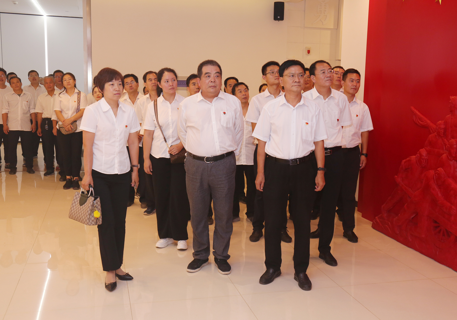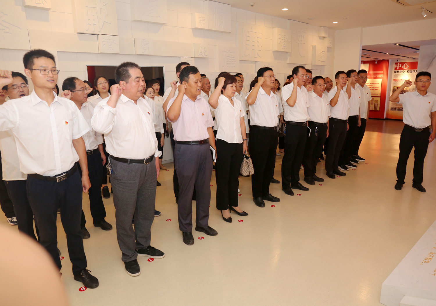 參觀結(jié)束后,全體黨員干部來(lái)到尾廳,面對(duì)鮮紅的黨旗莊嚴(yán)宣誓,用飽滿的熱情重溫了入黨初心。