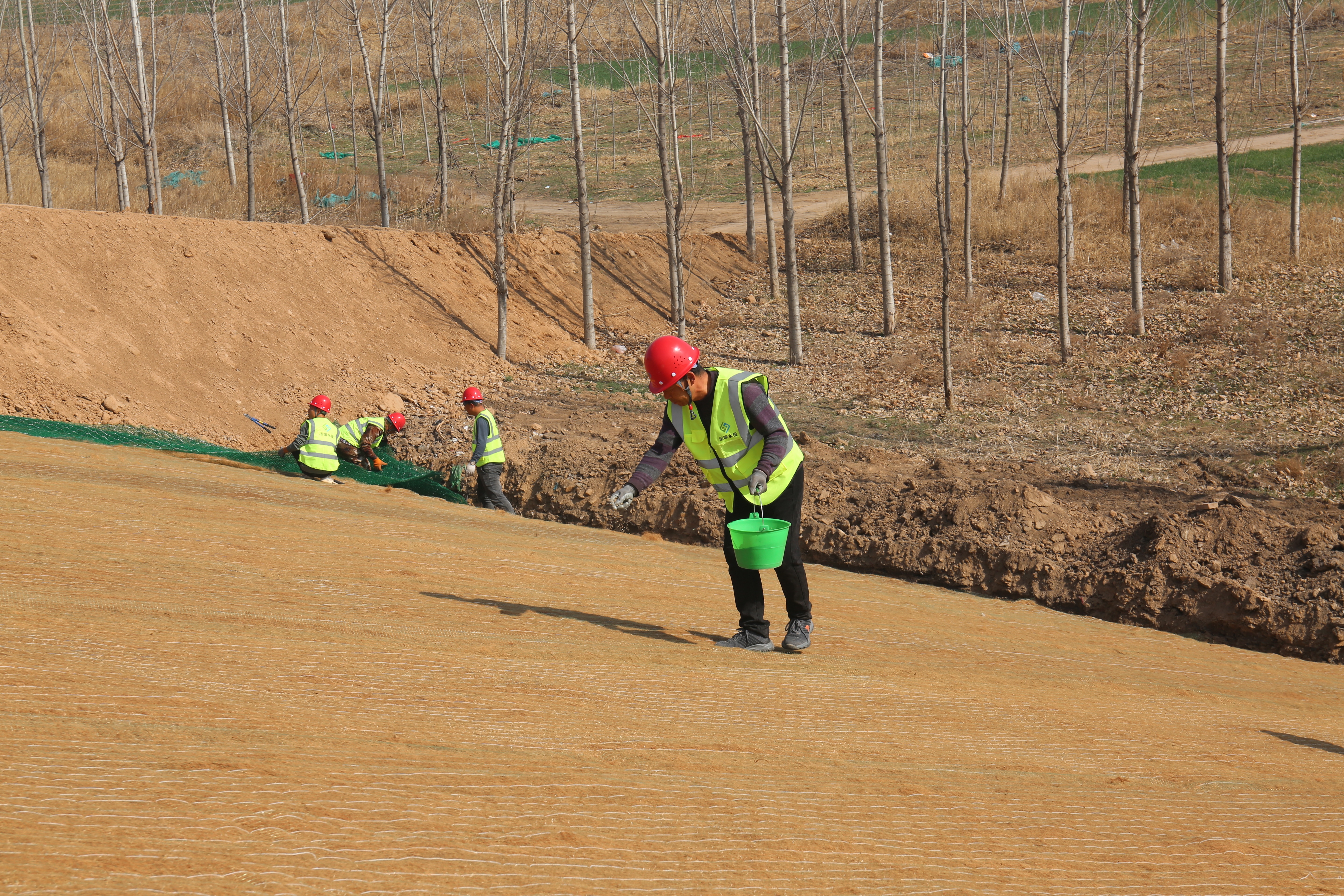施工現(xiàn)場(chǎng),工程機(jī)械、運(yùn)輸車輛、施工人員正在加緊作業(yè)。一片片椰絲毯經(jīng)過(guò)清除坡面雜物、坡度整修、開挖坑槽、播撒草籽等八道程序才能完好鋪設(shè)在大壩上。椰絲毯是一種新型環(huán)保材料,具有良好的吸水性、保濕性和透氣性,這種環(huán)保材料既可以起到穩(wěn)固河道邊坡、防止河岸沖刷破壞的作用,同時(shí)還能優(yōu)化生態(tài)環(huán)境。